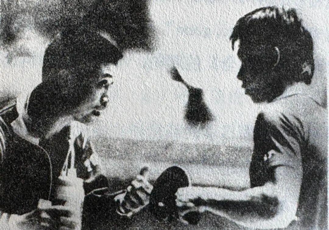 1983年第37届世乒赛,庄家富(左)为参加男单比赛的蔡振华做临场指导。