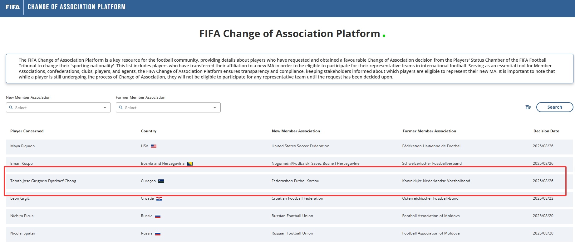 08月27日讯 FIFA球员会籍变更系统显示,25岁的华裔球员陈达毅(Tahith Jose Girigorio Djorkaef Chong)已经从荷兰足协转换到库拉索足协。这也意味着,陈达毅最终还是与中国国足无缘。